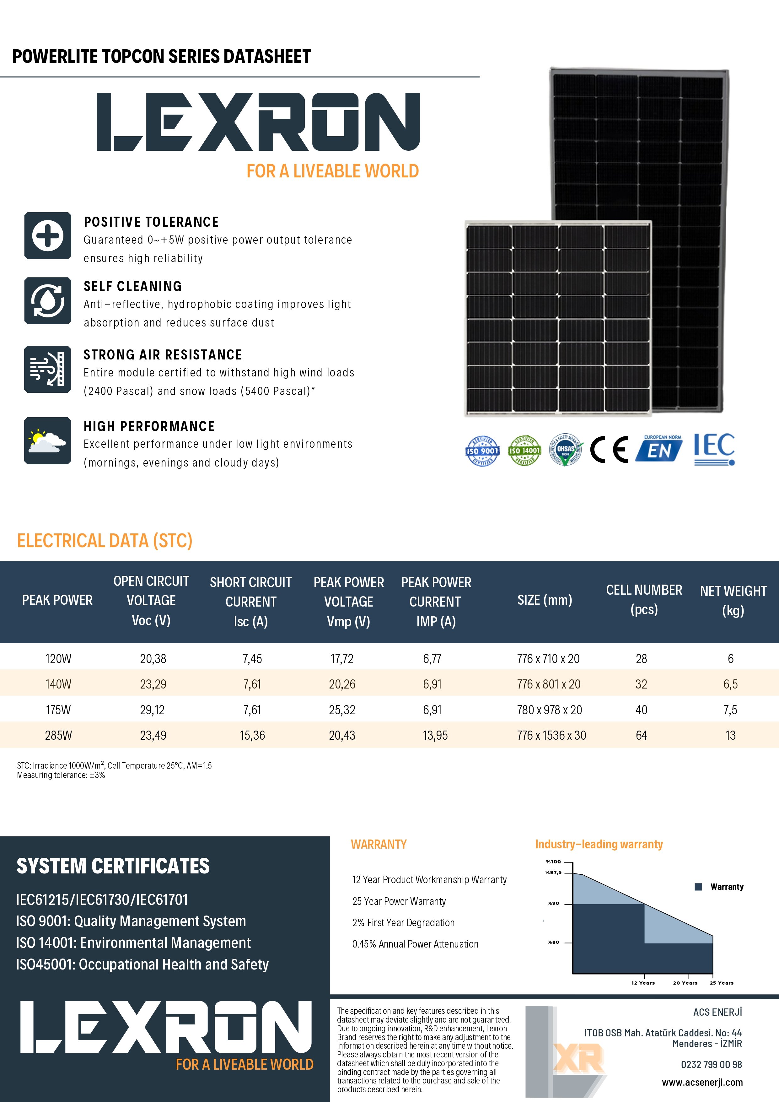 Lexron 285W Half-Cut Topcon 64 Hücreli Monokristal Güneş Paneli