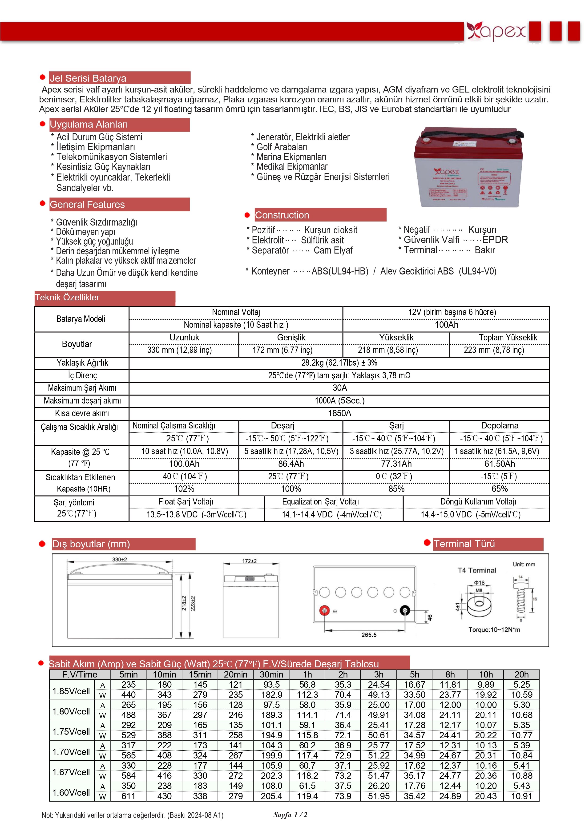 Apex 12V 100Ah Deep Cycle Jel Akü
