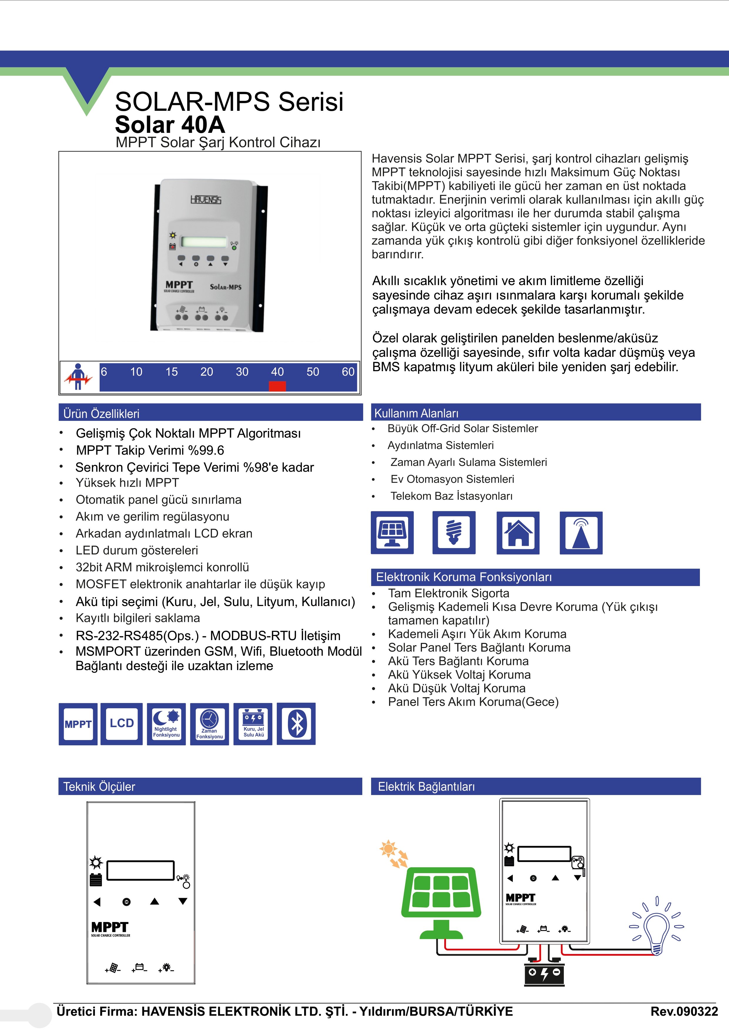 Havensis 12/24 Volt 40 Amper MPPT Solar Şarj Kontrol Cihazı, mikroişlemci kontrolü en yeni algoritmalar ile akülerin güvenli ve verimli bir şekilde şarj edilmesini sağlamaktadır.