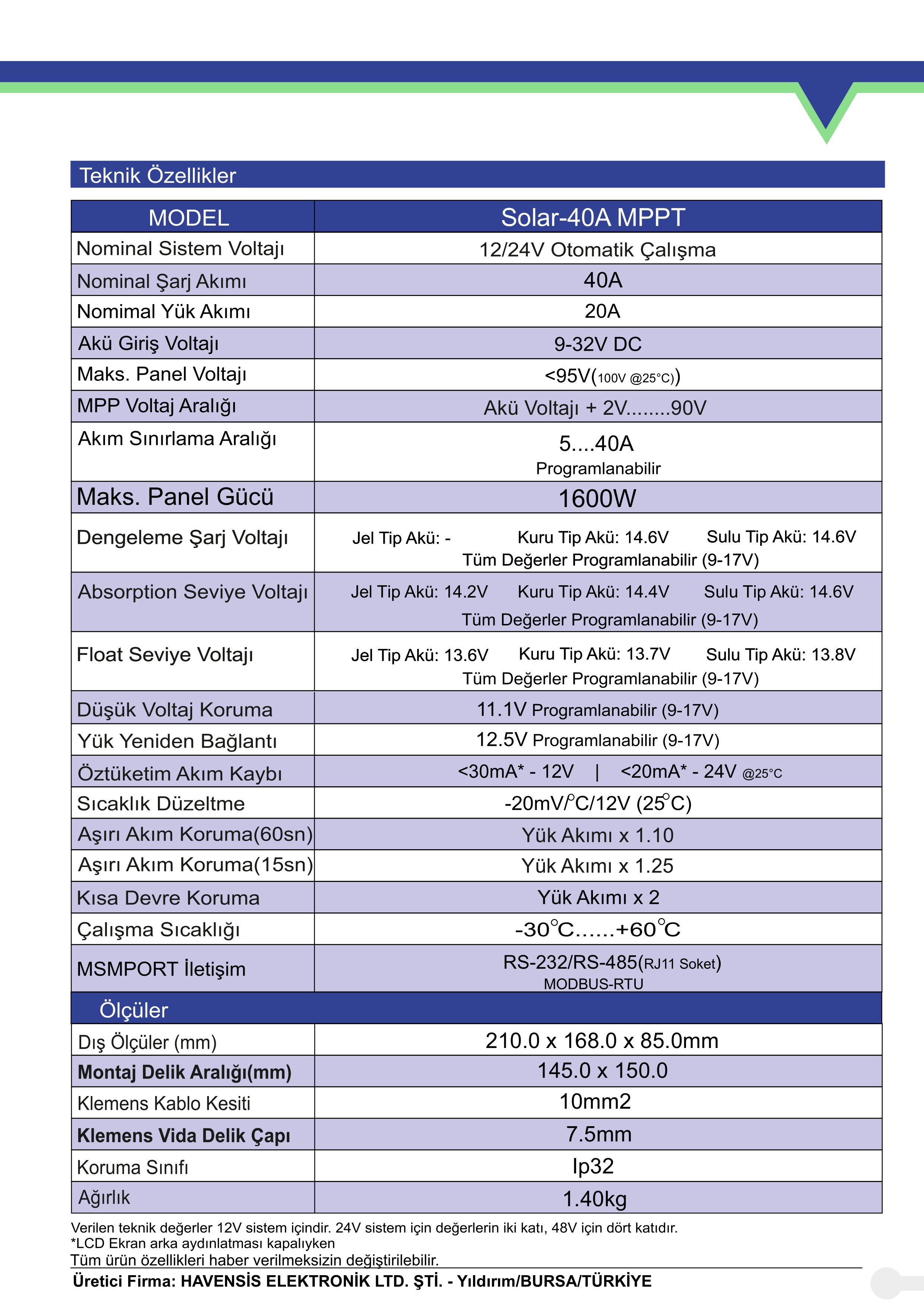 Havensis 12/24 Volt 40 Amper MPPT Solar Şarj Kontrol Cihazı Teknik Özellikleri