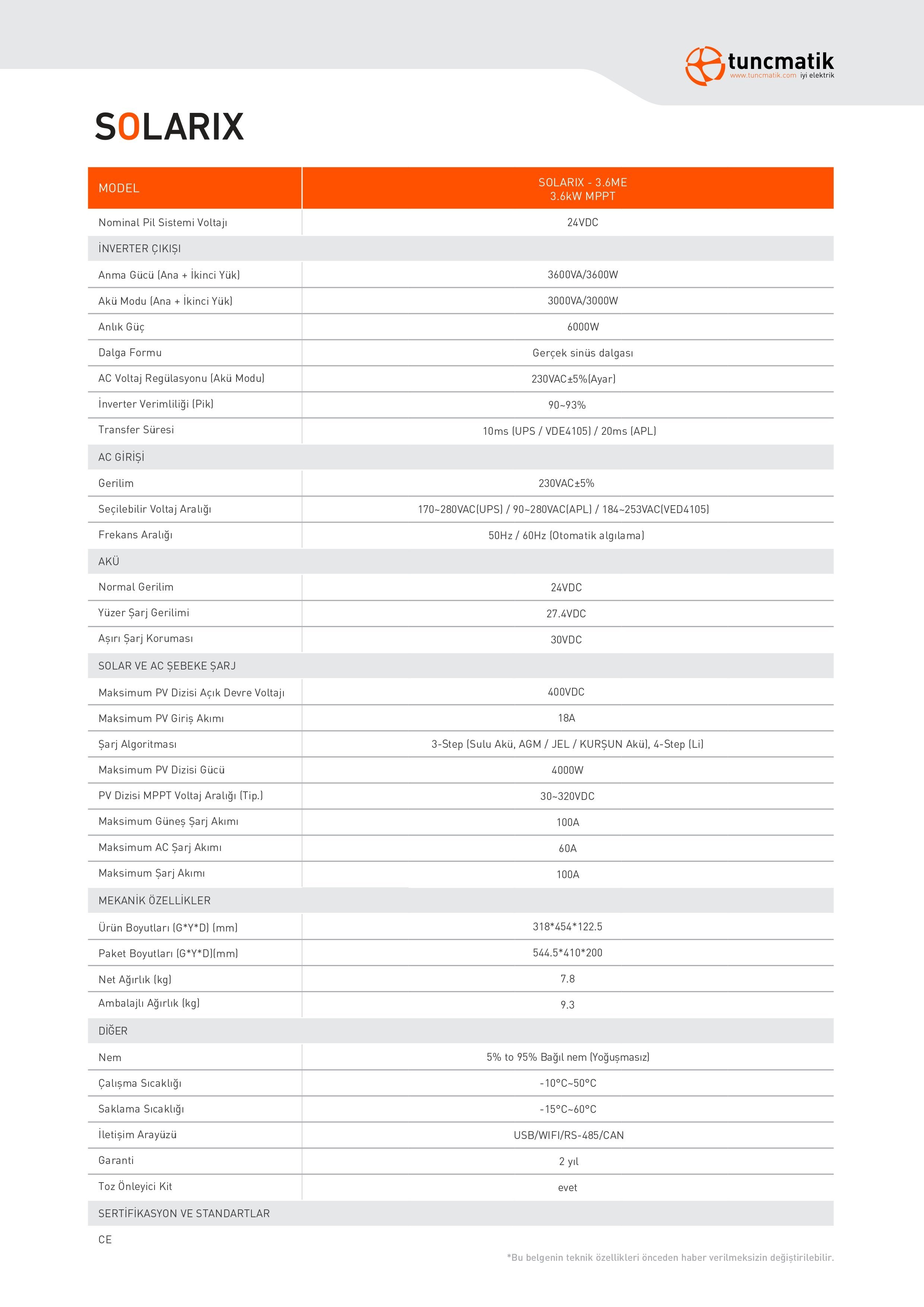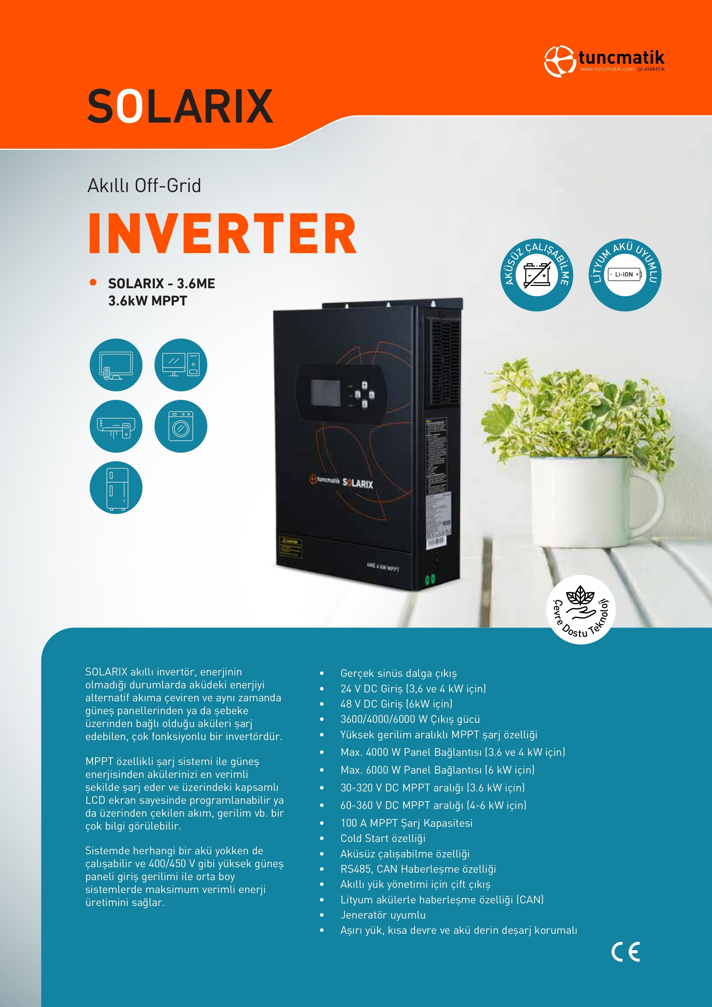 Tunçmatik Solarix 3.6kW 24V MPPT 100A Off-Grid Akıllı İnverter